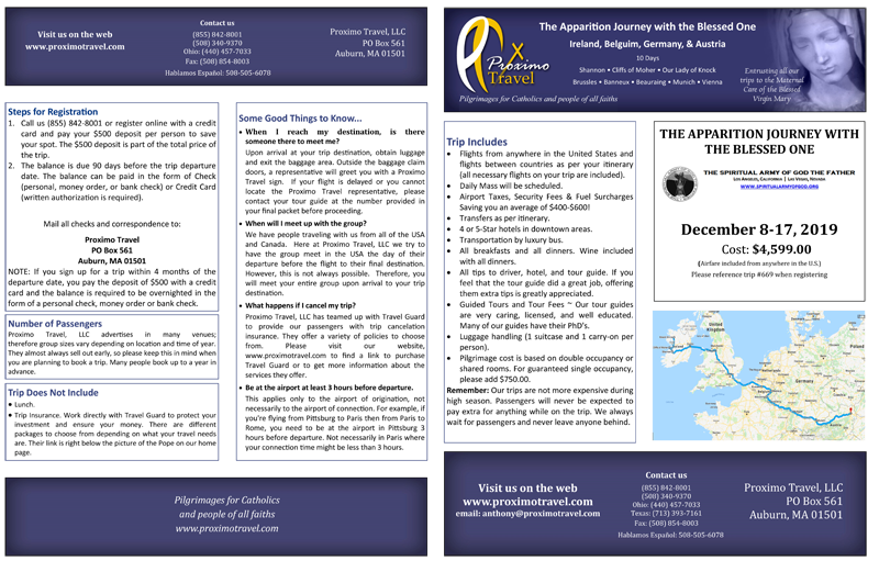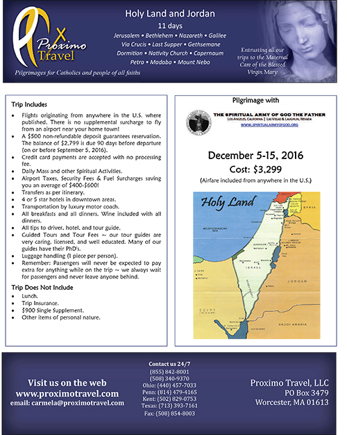 The Spiritual Army of God the Father sponsors pilgrimages to the Holy Land, Medjugorje, Poland, Prague, Fatima, Rome, and other Holy Sites.